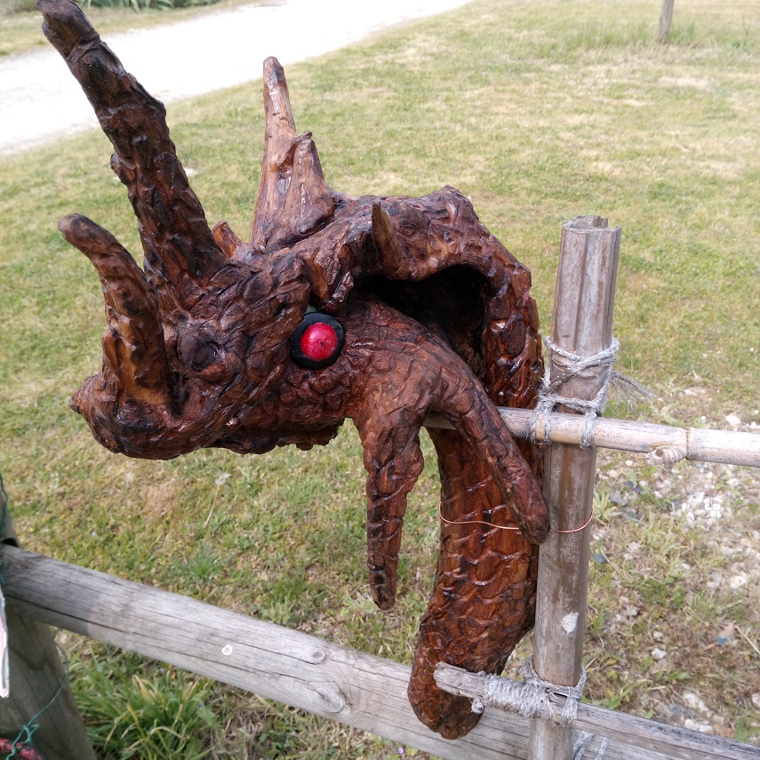 constitué de bois flotté, gravé puis peint