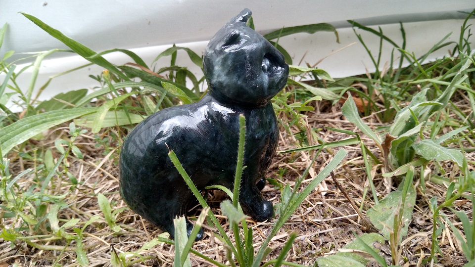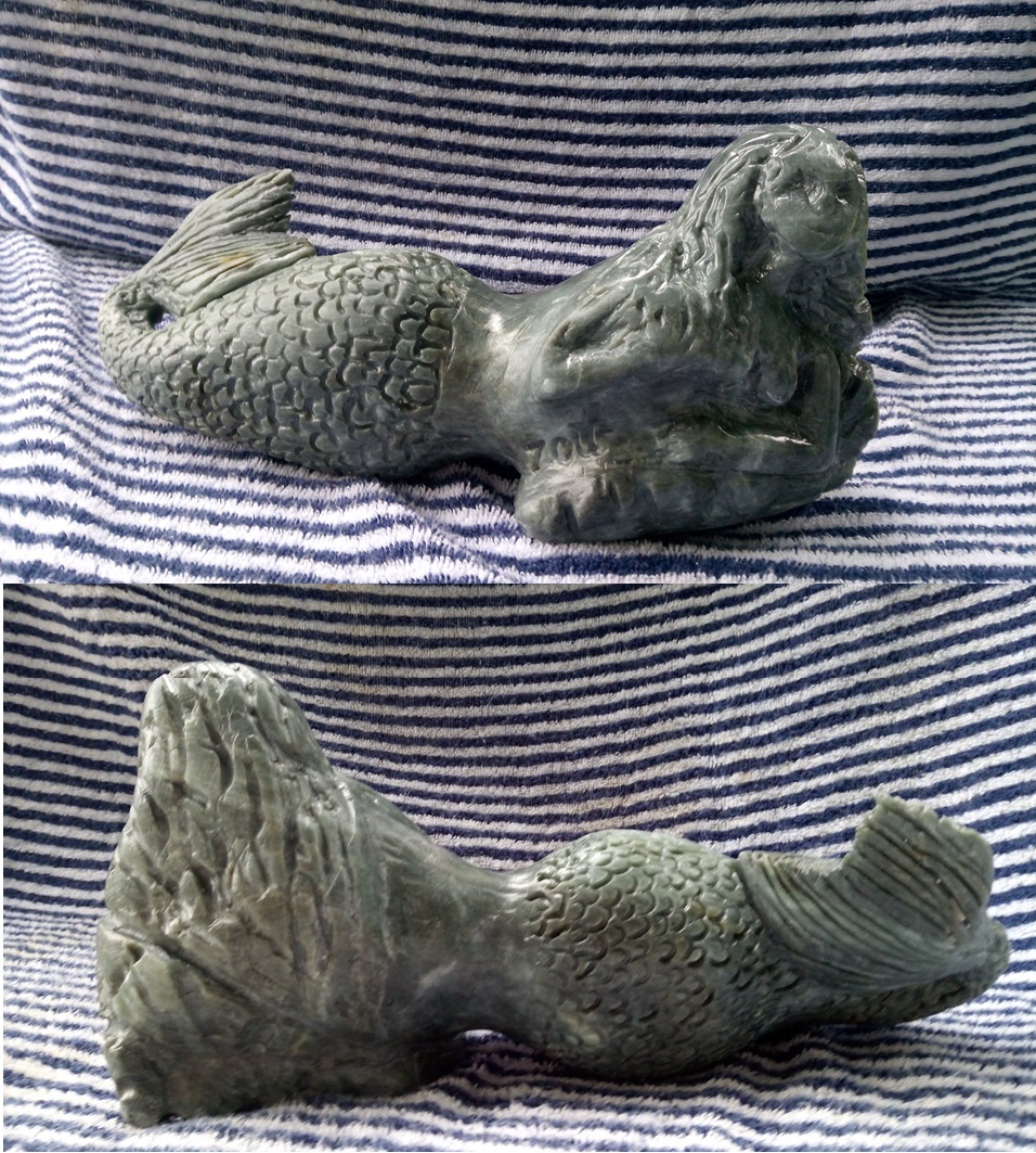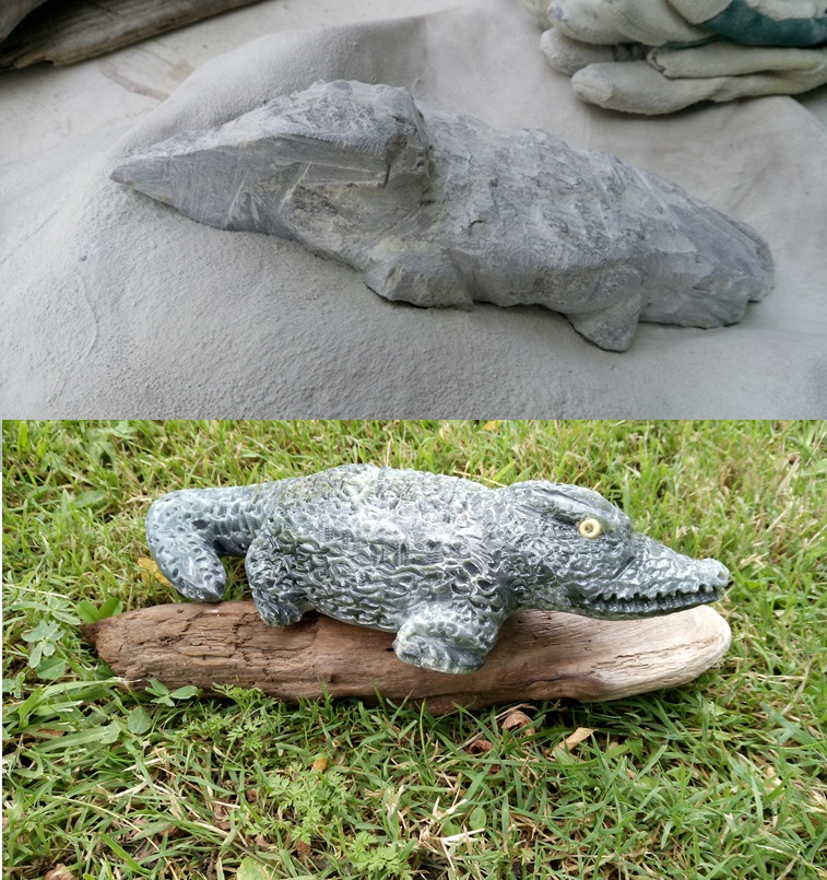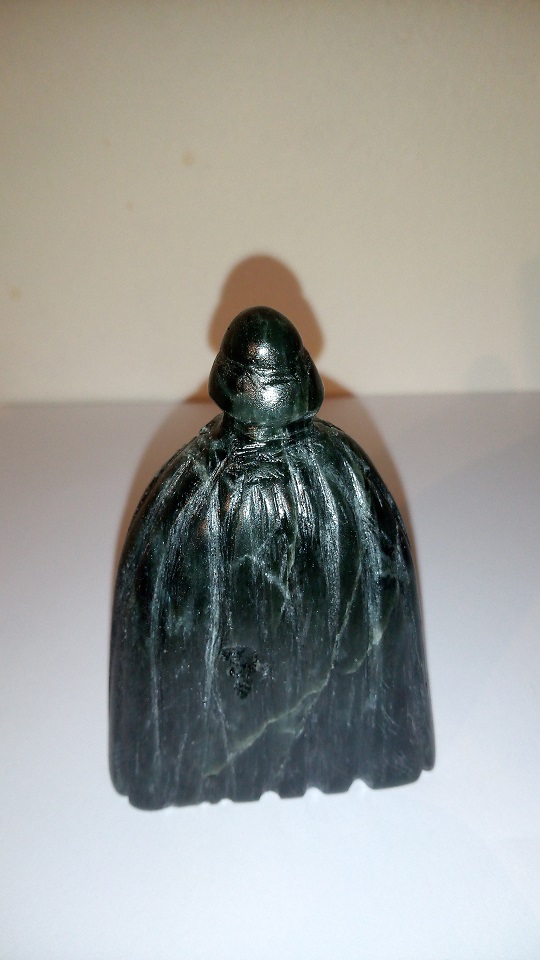 Il est sculpté dans de la stéatite grise, puis verni.