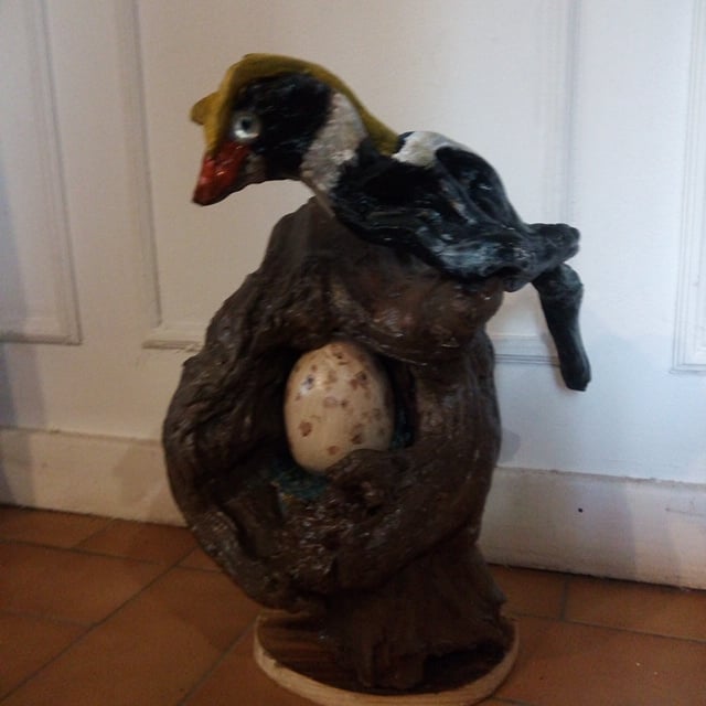 pâte à bois, puis peinte aux couleurs du corps. Le