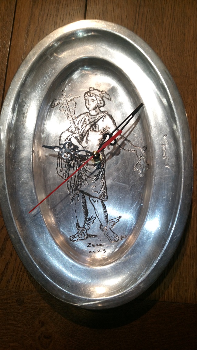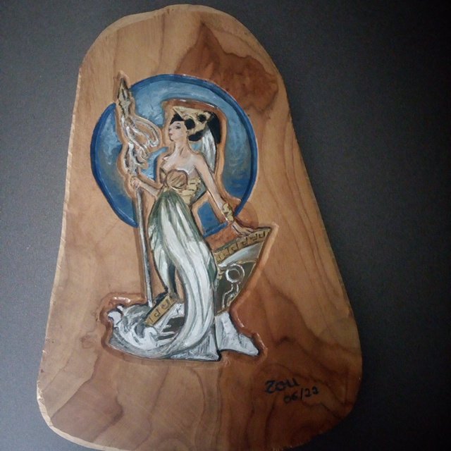 Après le tatouage, la gravure sur bois... la pendule Athéna (déesse de la sagesse).