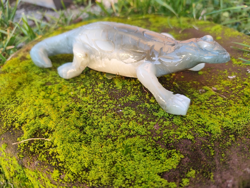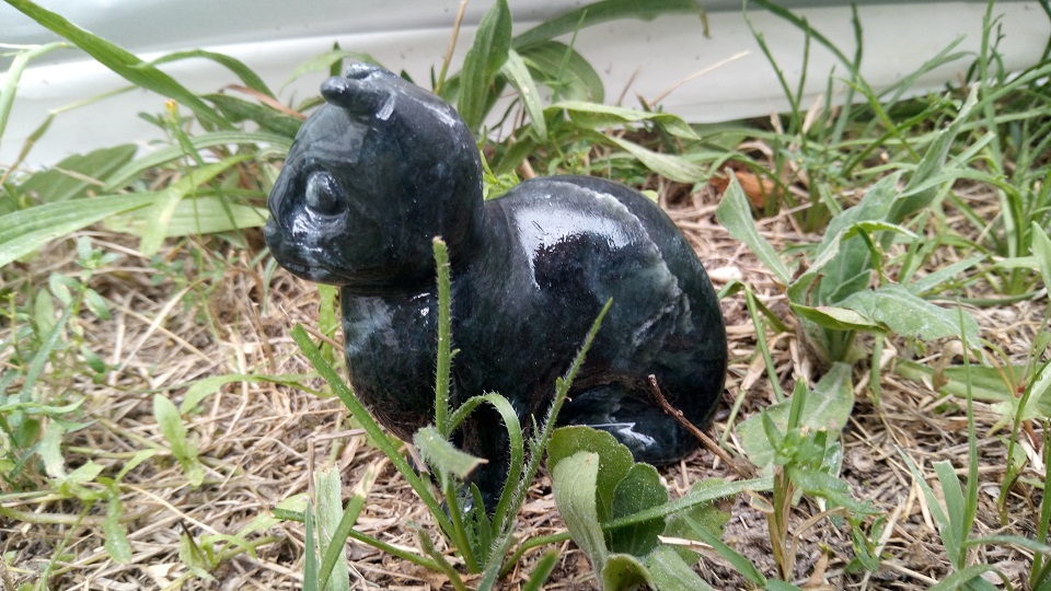 Il est sculpté dans de la stéatite grise, puis verni.